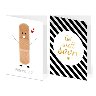 Voor een beterschapskaart heb je de keuze uit verschillende formaten. Maak allereerst de keuze voor een enkele of een dubbele kaart. Kies je voor enkel, dan kan je jouw wenskaart laten drukken op A6 en A5 formaat. Wanneer je kiest voor dubbel, bieden wij de volgende formaten: A6, A5, A4, 14x14 cm en 10x10 cm. Bij alle formaten wordt standaard een envelop meegeleverd, zodat je de kaart gemakkelijk naar de desbetreffende persoon kan sturen.