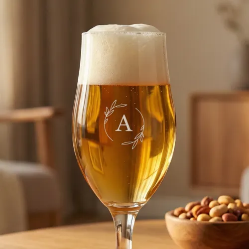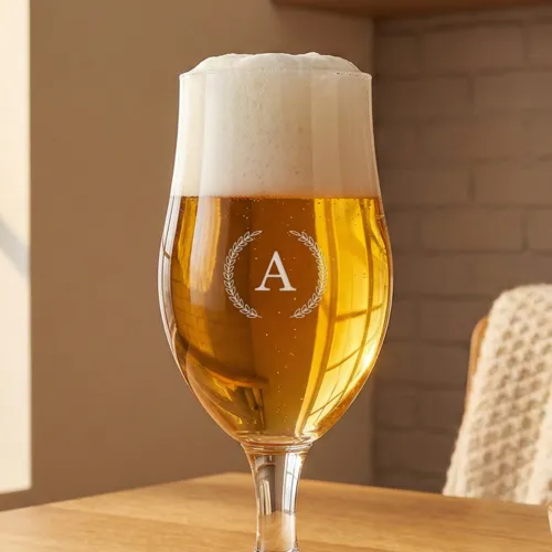 Voeg eenvoudig een eigen tekst toe en maak een uniek bierglas voor elke gelegenheid.