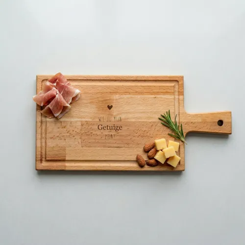 - Wil jij...?Eigen naam · Hout of PlexiglasSommige vragen stel je niet zomaar tussen neus en lippen door. Of je nu je beste vriend vraagt als getuige, je geliefde als Valentijn of je favoriete oom als ceremoniemeester: deze borrelplank maakt het moment onvergetelijk. <BREAK> Combineer de plank met wat lekkere hapjes en wacht tot de vraag onder de kaasjes en worstjes vandaan komt.Goudfolie0 foto's