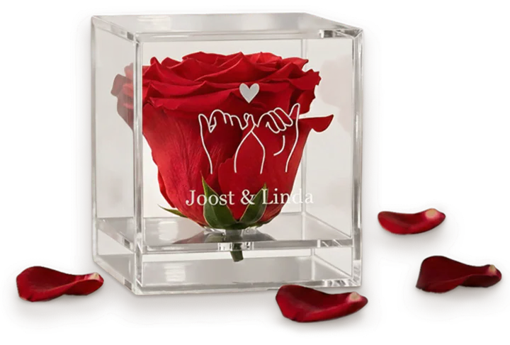 Verras met meer dan een bloem. Een roos in glas staat voor blijvende liefde en bijzondere momenten. De luxe plexiglas doos en persoonlijke gravure maken dit cadeau uniek en onvergetelijk. Perfect om te geven bij een speciaal moment, of gewoon zomaar.