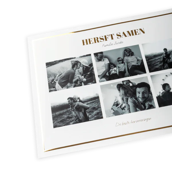 Sommige herinneringen zijn zó waardevol, dat ze vragen om een extra bijzondere manier van vastleggen. Dit kan door de tekst op de cover van je fotoboek in gouden letters te laten drukken. Deze stijlvolle, glanzende afwerking geeft je titel, naam of jaartal een luxe uitstraling en maakt je boek écht speciaal. Voeg de gouden tekst gemakkelijk toe in de Online Editor, tegen een kleine meerprijs van € 5,99 per boek.