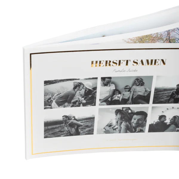 Geef je softcover fotoboek een vleugje luxe met een titel of naam in glanzend goudfolie op de cover. Deze subtiele afwerking maakt jouw boek bijzonder en past perfect bij momenten die je wilt koesteren!