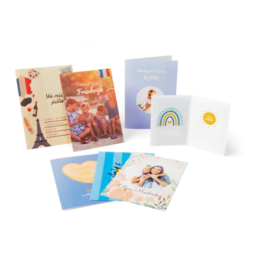 Ze zijn verkrijgbaar als enkele kaart of als een dubbelgevouwen kaart. Alle zijdes zijn te bedrukken met jouw eigen foto’s, teksten, cliparts of sjablonen. Verder heb jij de mogelijkheid om jouw kaarten nog mooier te maken met een hoogglans of natuurwit afwerking.