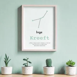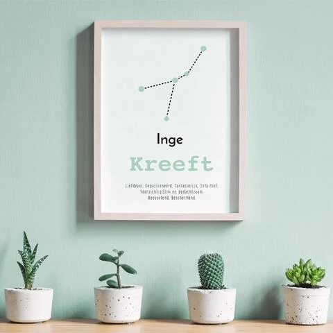 Een horoscoopposter is leuk om als cadeau te geven aan kersverse ouders. Ga voor het juiste sterrenbeeld en plaats de naam van het kindje op de poster. Ook kan je andere informatie op de poster plaatsen zoals de geboortedatum en geboortetijd. Verras de kersverse ouders met de sterrenbeeldposter en op deze manier hebben ze meteen een leuke wanddecoratie die opgehangen kan worden in de babykamer. Naast dat het een leuk kraamcadeau is, is het ook een leuk cadeau voor een vriend, vriendin of geliefde.